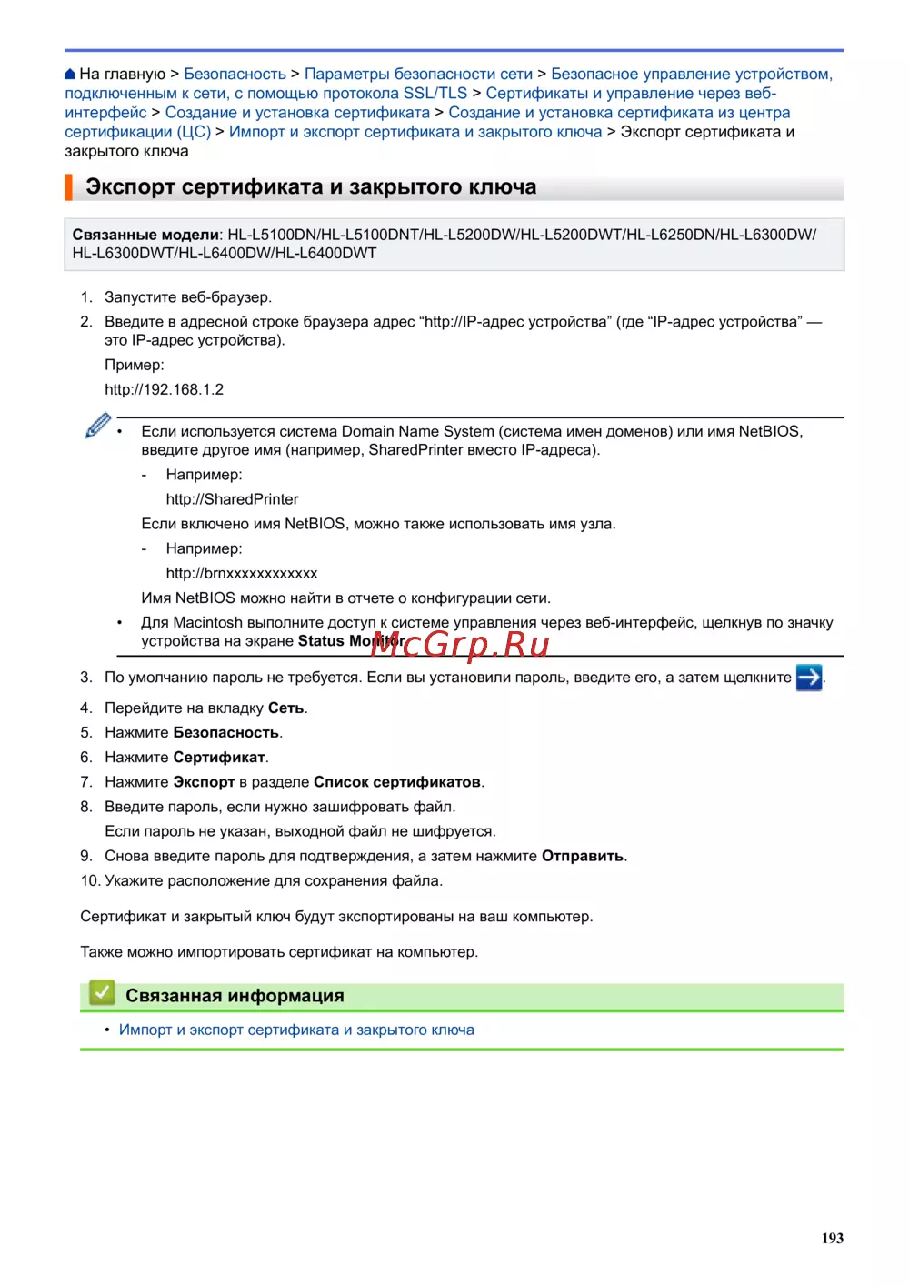 Brother HL-L6400DWT — экспорт и импорт сертификатов для безопасного управления устройствами [198/407]