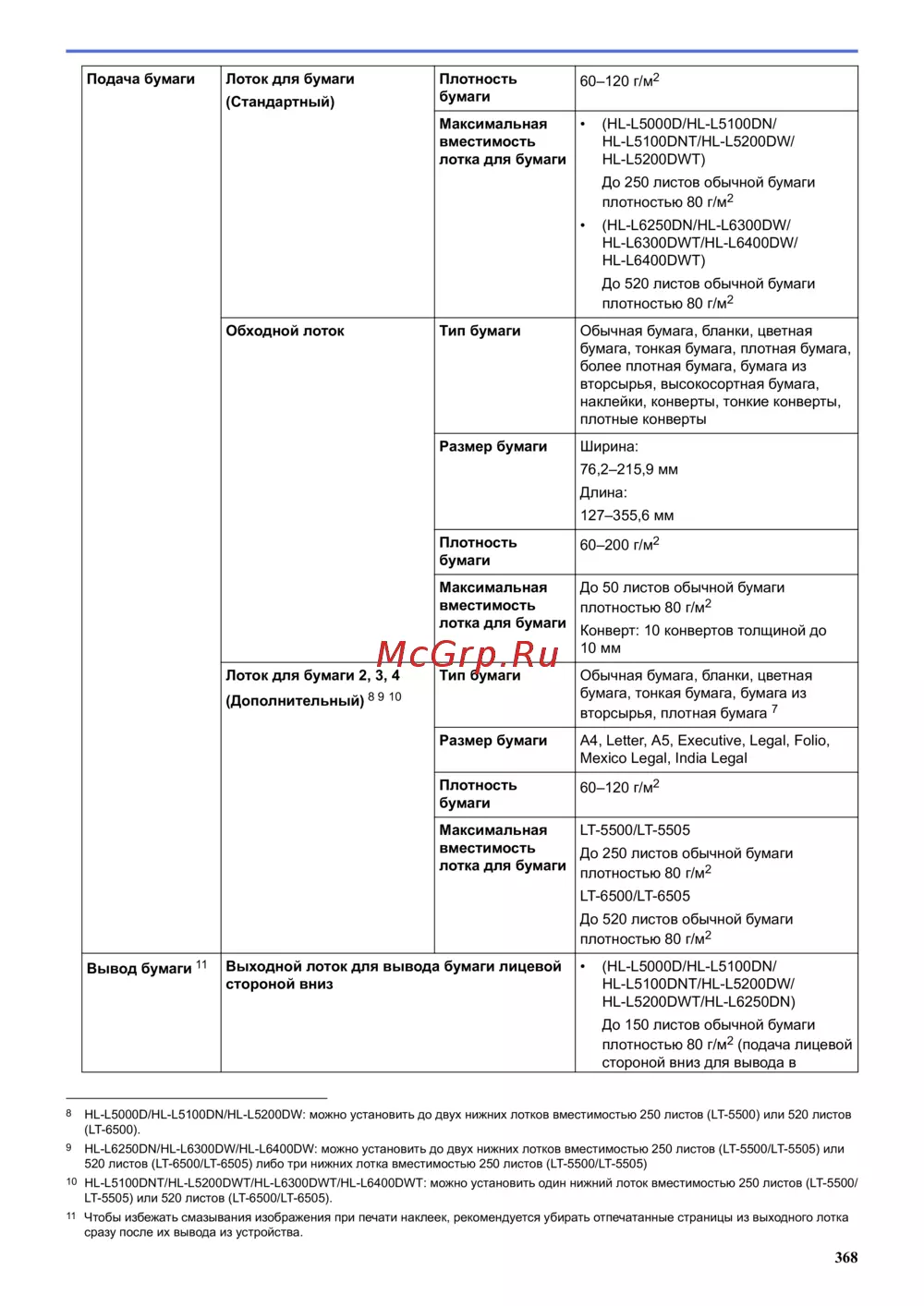 HL-L5100DNT/HL-L5200DWT/HL-L6300DWT/HL-L6400DWT: можно установить один нижний лоток вместимостью 250 листов (LT-5500/