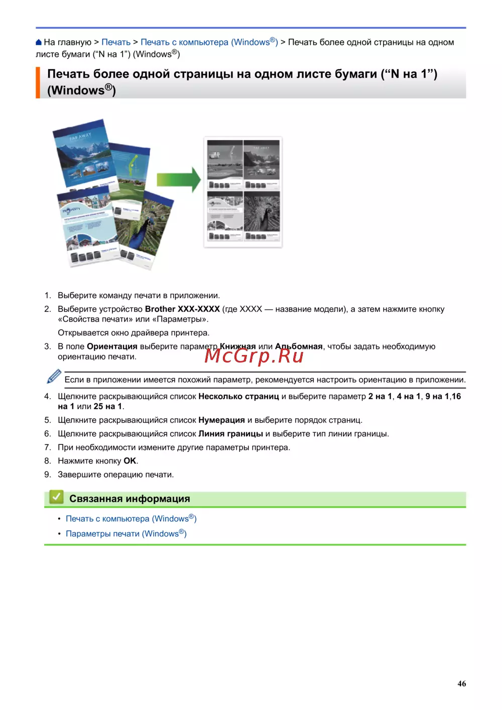 Печать более одной страницы на одном листе бумаги (“N на 1”)