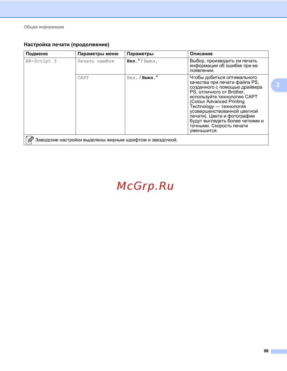 BR-Script 3 Печать ошибок Вкл.* / Выкл. Выбор, производить ли печать