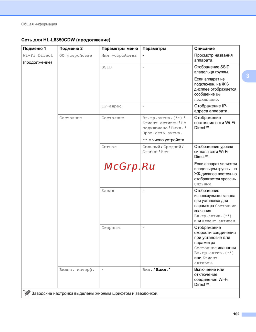 Заводские настройки выделены жирным шрифтом и звездочкой.