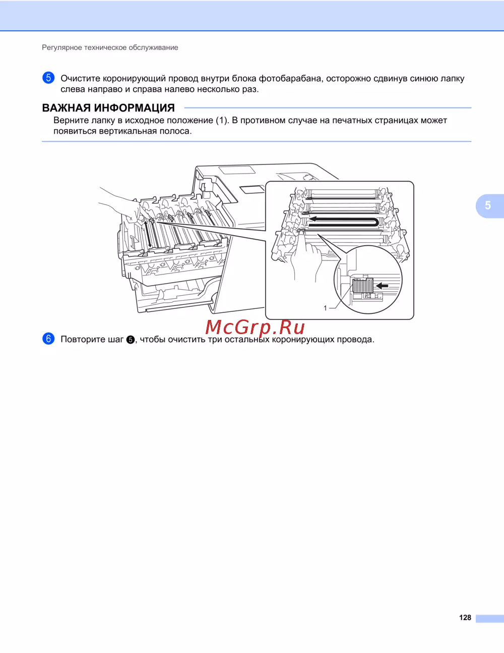 e Очистите коронирующий провод внутри блока фотобарабана, осторожно сдвинув синюю лапку