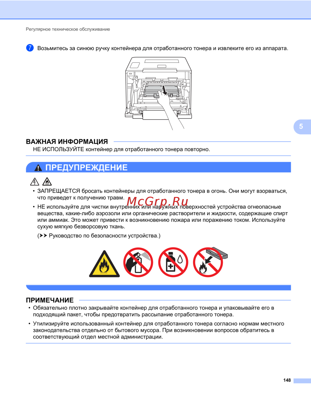 • ЗАПРЕЩАЕТСЯ бросать контейнеры для отработанного тонера в огонь. Они могут взорваться,