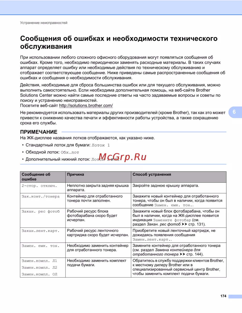 - Действия необходимые для сброса большинства ошибок или для текущего обслуживания можно выполнить самостоятельно если необходима дополнительная помощь на веб сайте brother solutions center можно найти самые последние ответы на часто задаваемые вопросы и советы по поиску и устранению неисправностей посетите веб сайт http solutions brother com p.181