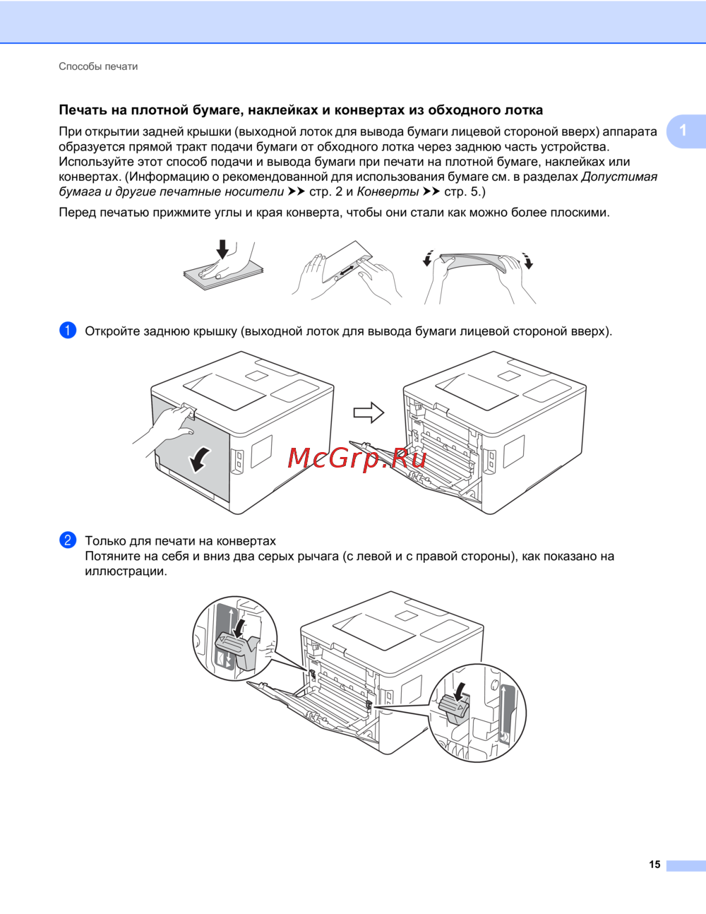 - Печать на плотной бумаге наклейках и конвертах из обходного лотка p.22
