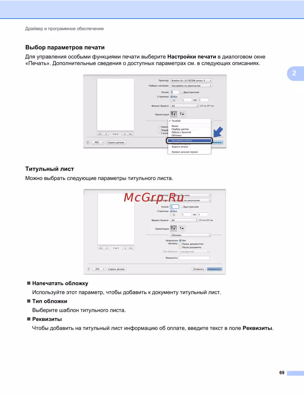 «Печать». Дополнительные сведения о доступных параметрах см. в следующих описаниях.