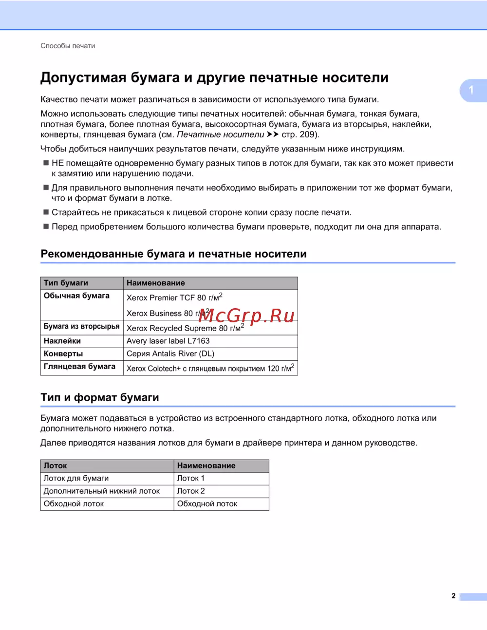 - Печать на обычной бумаге тонкой бумаге или бумаге из вторсырья из лотка 1 и лотка p.15