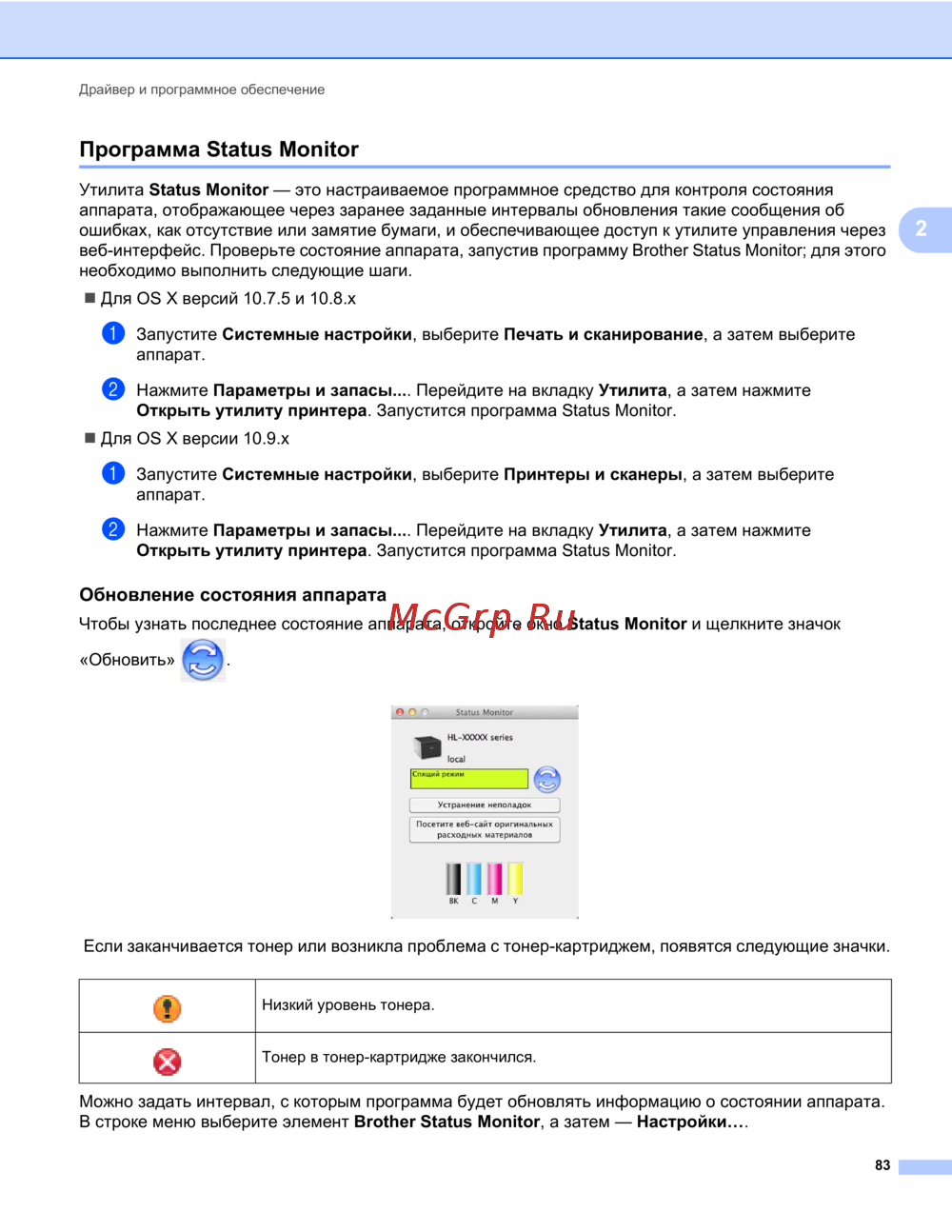 веб-интерфейс. Проверьте состояние аппарата, запустив программу Brother Status Monitor; для этого