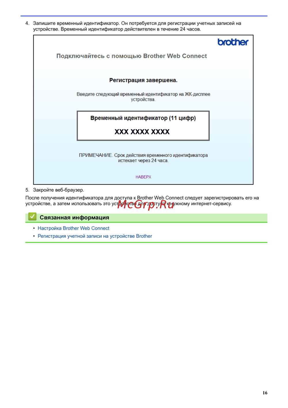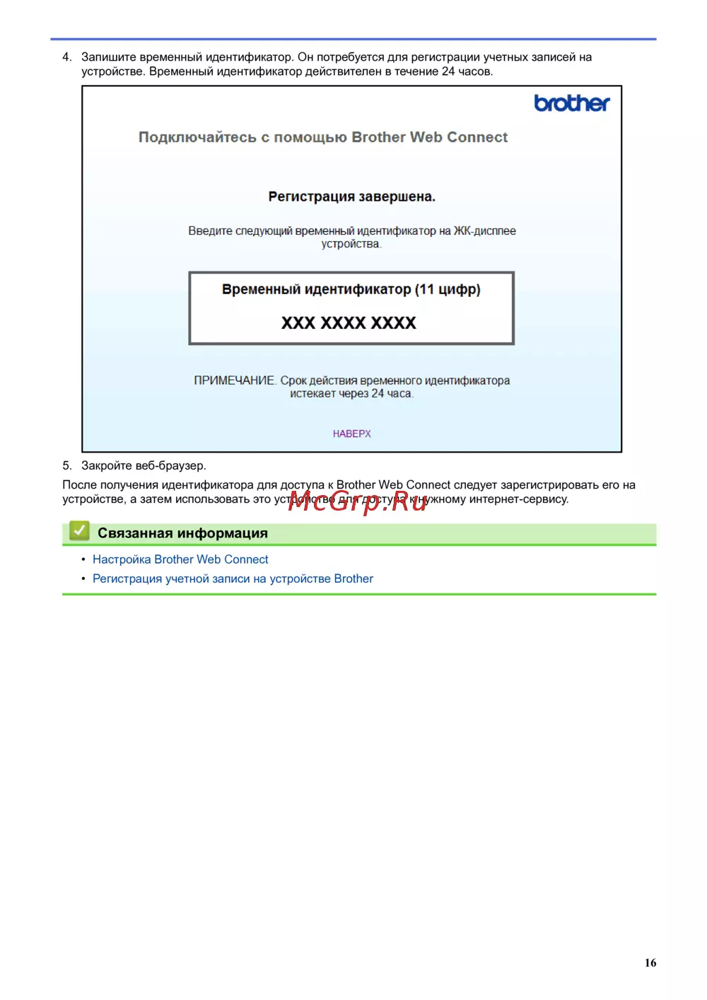 После получения идентификатора для доступа к Brother Web Connect следует зарегистрировать его на