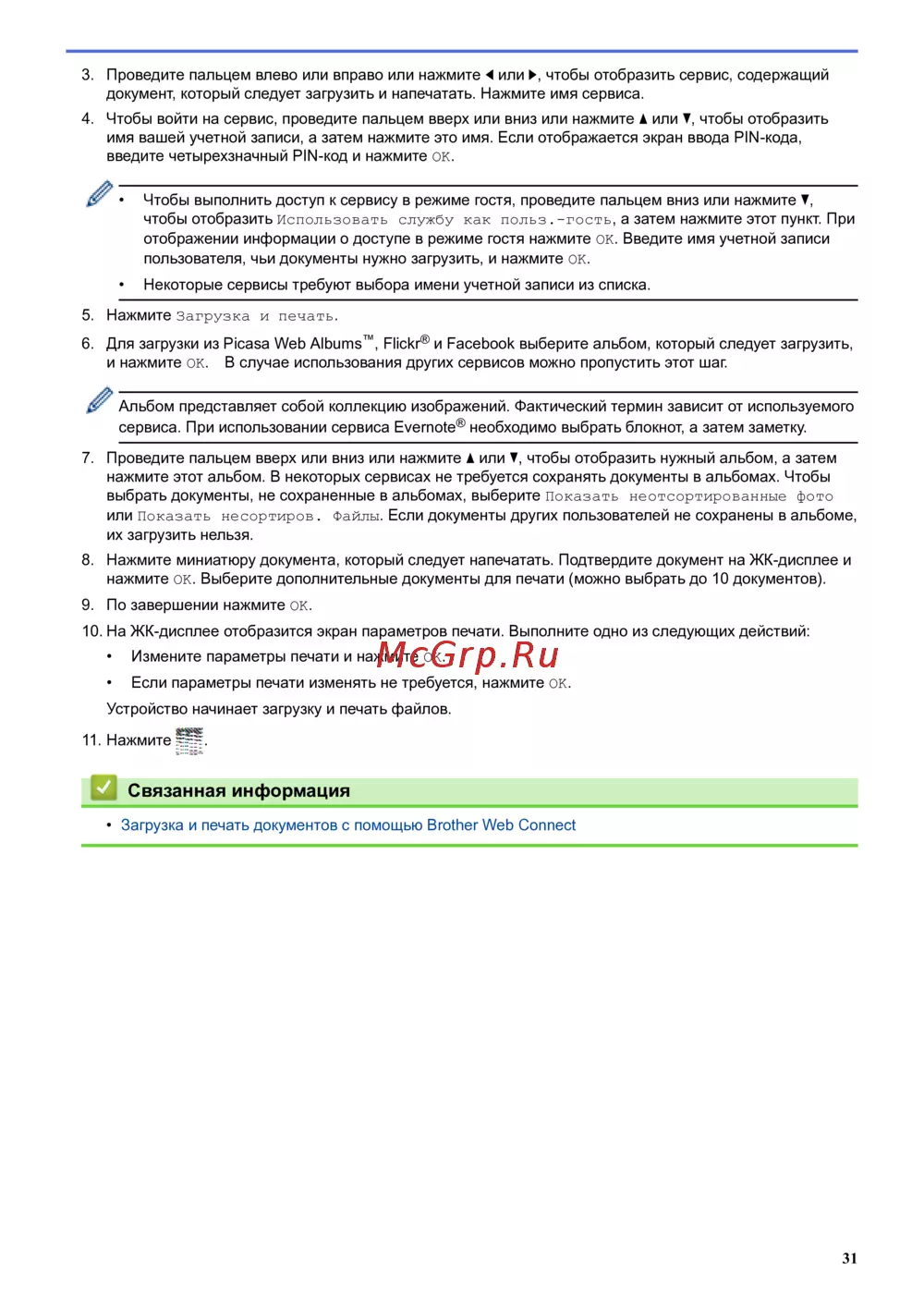 • Загрузка и печать документов с помощью Brother Web Connect
