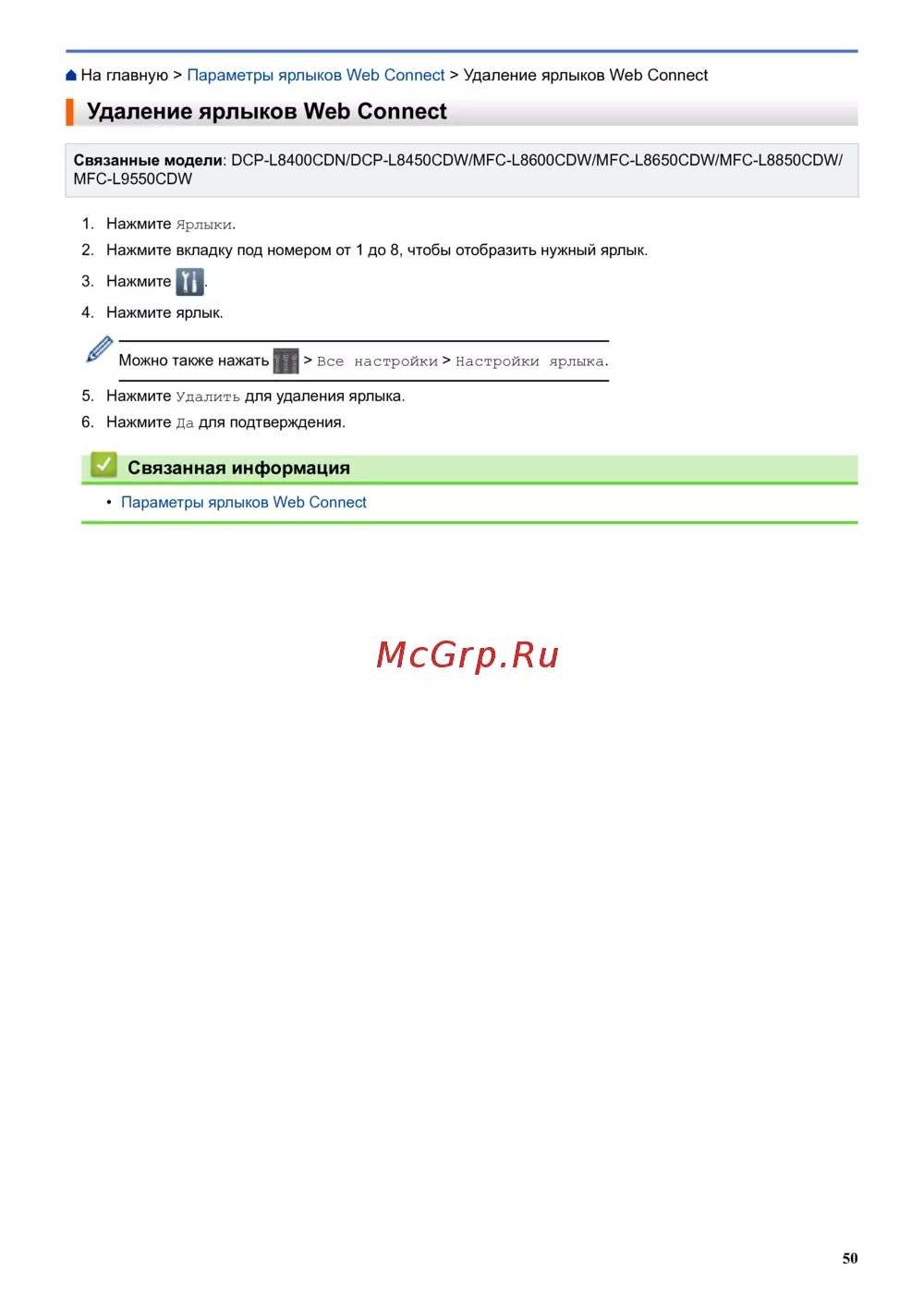 На главную > Параметры ярлыков Web Connect > Удаление ярлыков Web Connect