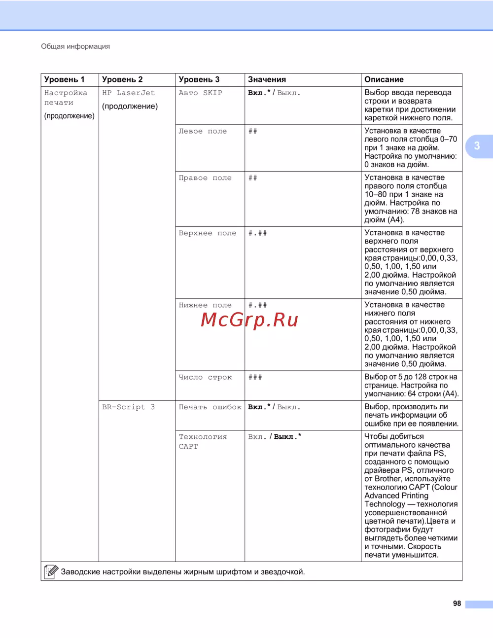 Заводские настройки выделены жирным шрифтом и звездочкой.