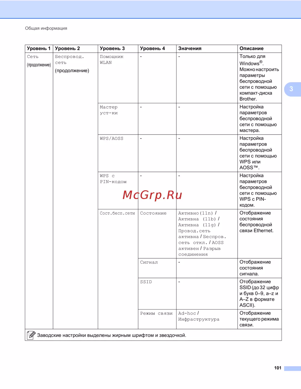 Заводские настройки выделены жирным шрифтом и звездочкой.