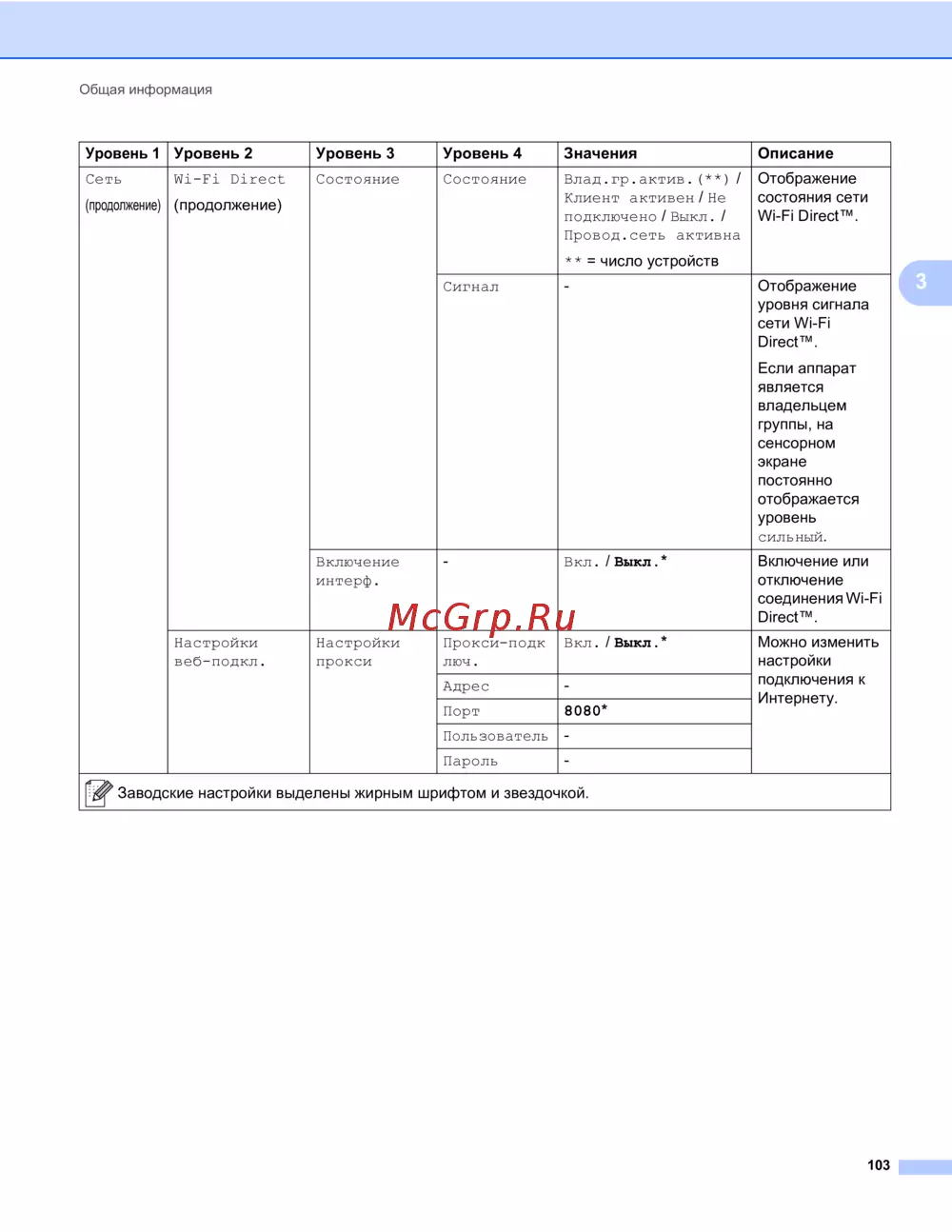 Заводские настройки выделены жирным шрифтом и звездочкой.