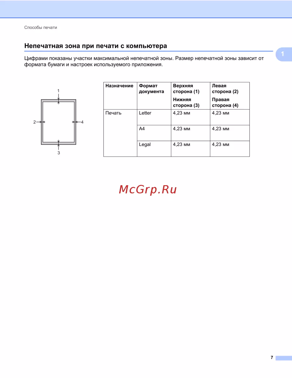 Цифрами показаны участки максимальной непечатной зоны. Размер непечатной зоны зависит от