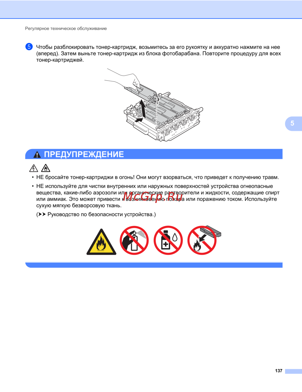 • НЕ бросайте тонер-картриджи в огонь! Они могут взорваться, что приведет к получению травм.