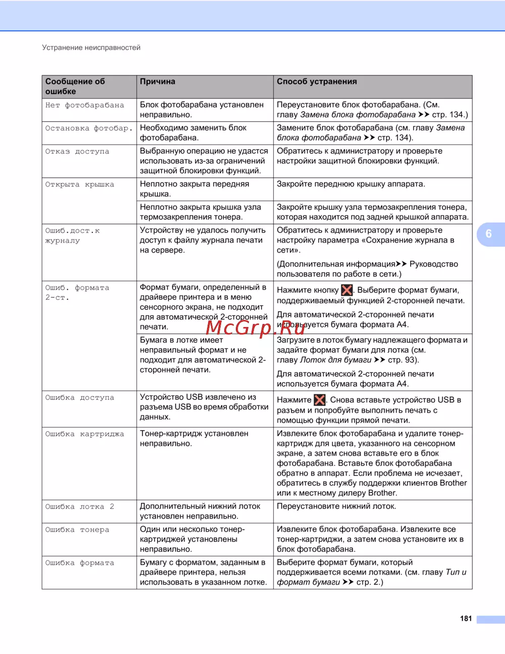 - Действия необходимые для сброса большинства ошибок или для текущего обслуживания можно выполнить самостоятельно если необходима дополнительная помощь на веб сайте brother solutions center можно найти самые последние ответы на часто задаваемые вопросы и советы по поиску и устранению неисправностей посетите веб сайт http solutions brother com p.184