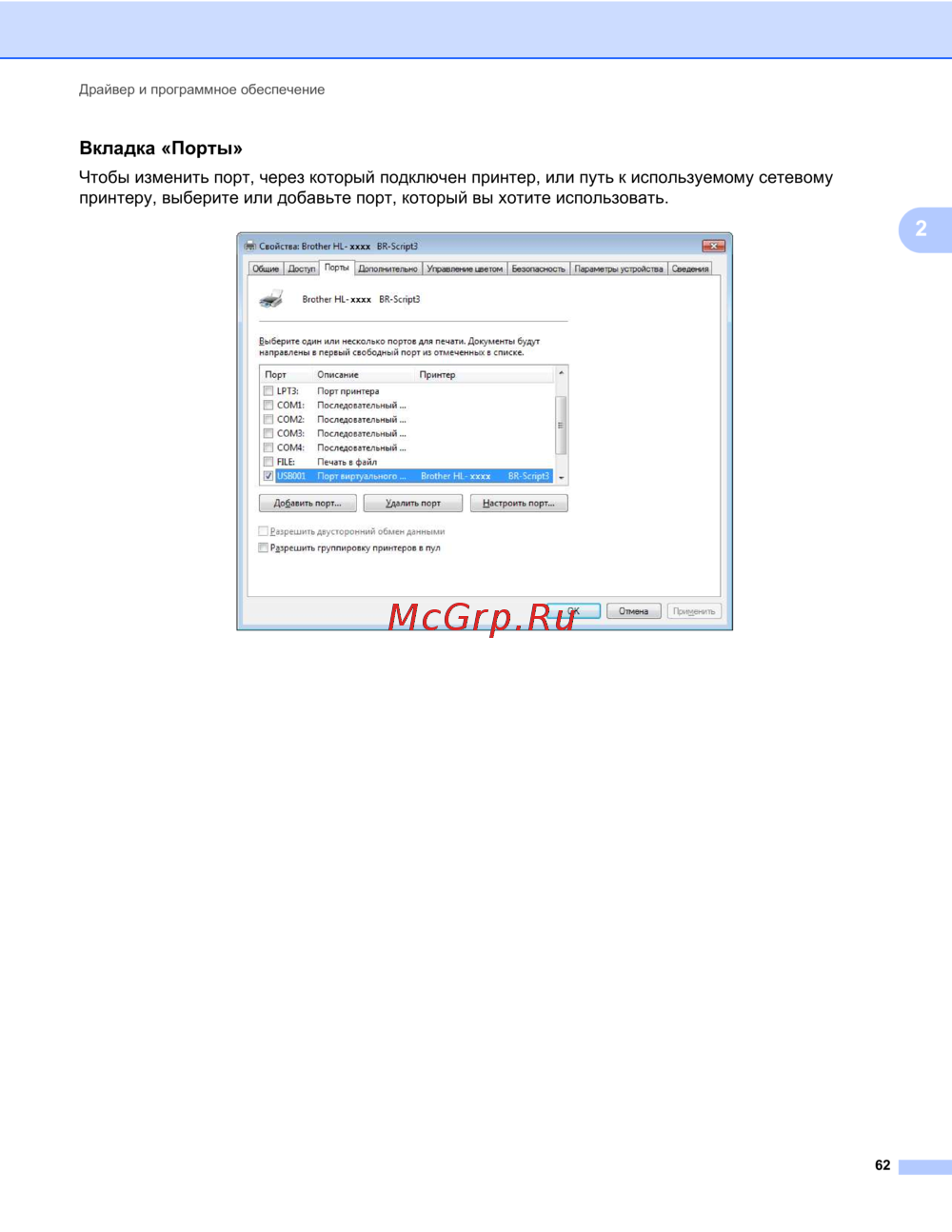 Brother HL-L9200CDWT [69/228] Чтобы изменить порт через который подключен принтер или путь к используемому сетевому принтеру выберите или добавьте порт который вы хотите использовать