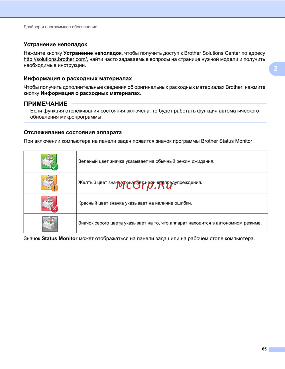 - Действия необходимые для сброса большинства ошибок или для текущего обслуживания можно выполнить самостоятельно если необходима дополнительная помощь на веб сайте brother solutions center можно найти самые последние ответы на часто задаваемые вопросы и советы по поиску и устранению неисправностей посетите веб сайт http solutions brother com p.184