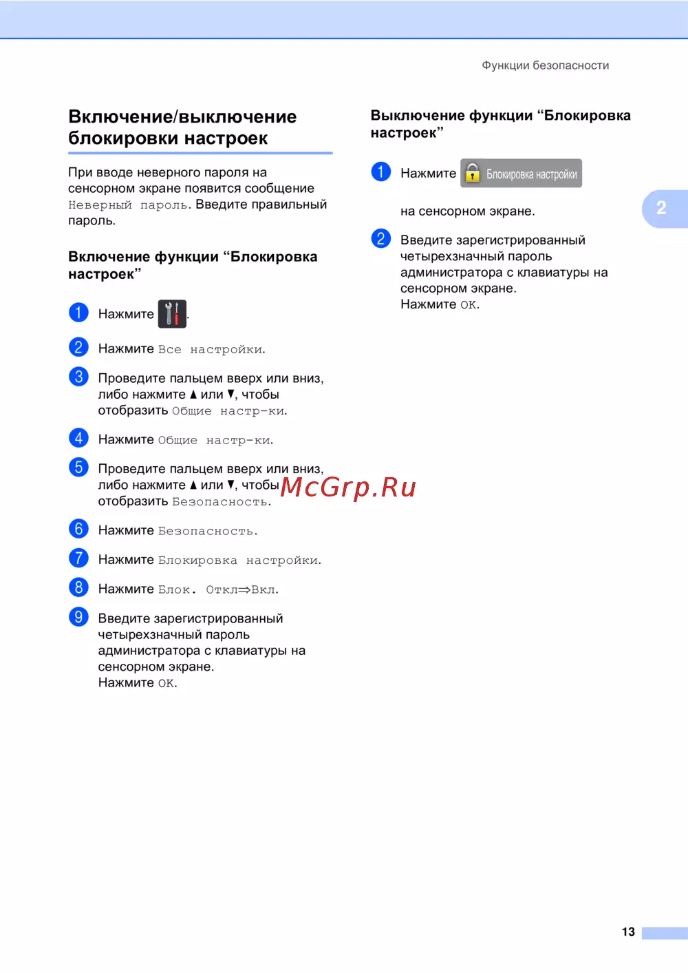 - Перед началом работы с защитной блокировкой функций 2 p.12