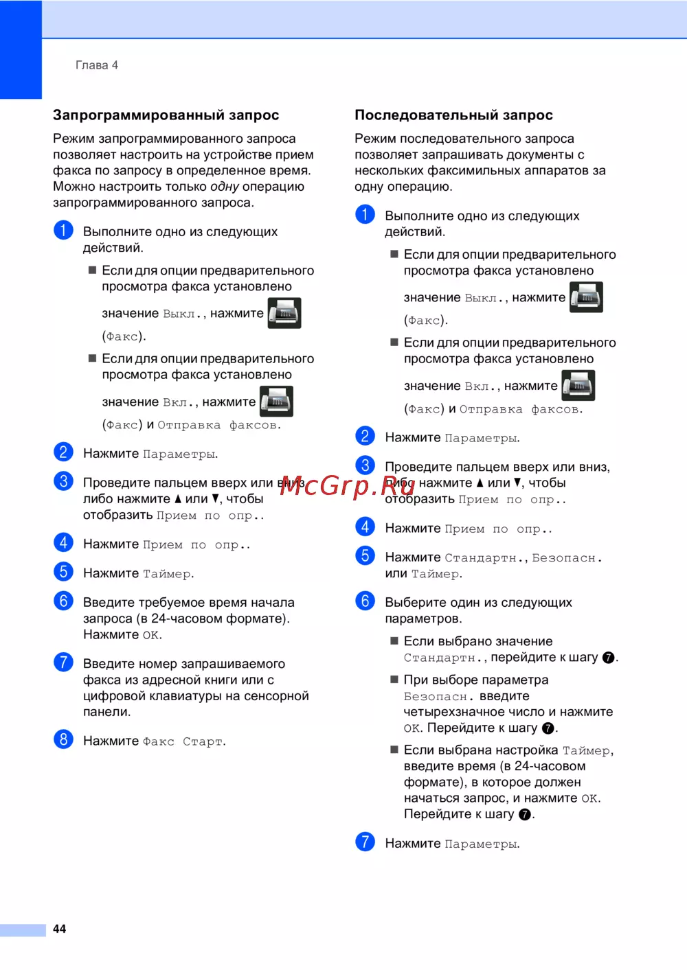 Инструкция по настройке приема факсов с таймером и параметрами для автоматизации процессов. Узнайте, как настроить запрограммированный и последовательный запросы факсов.