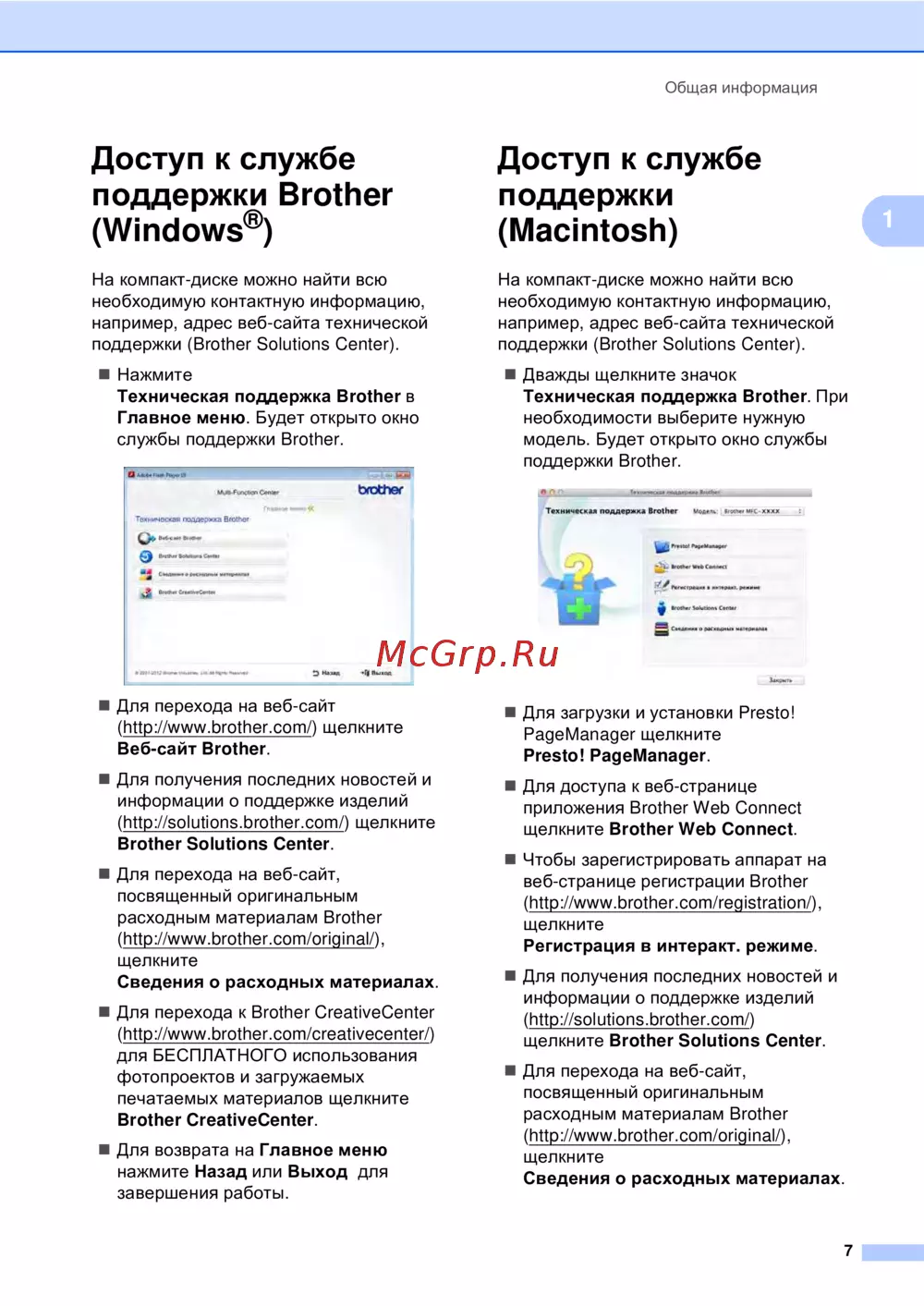 поддержки (Brother Solutions Center).