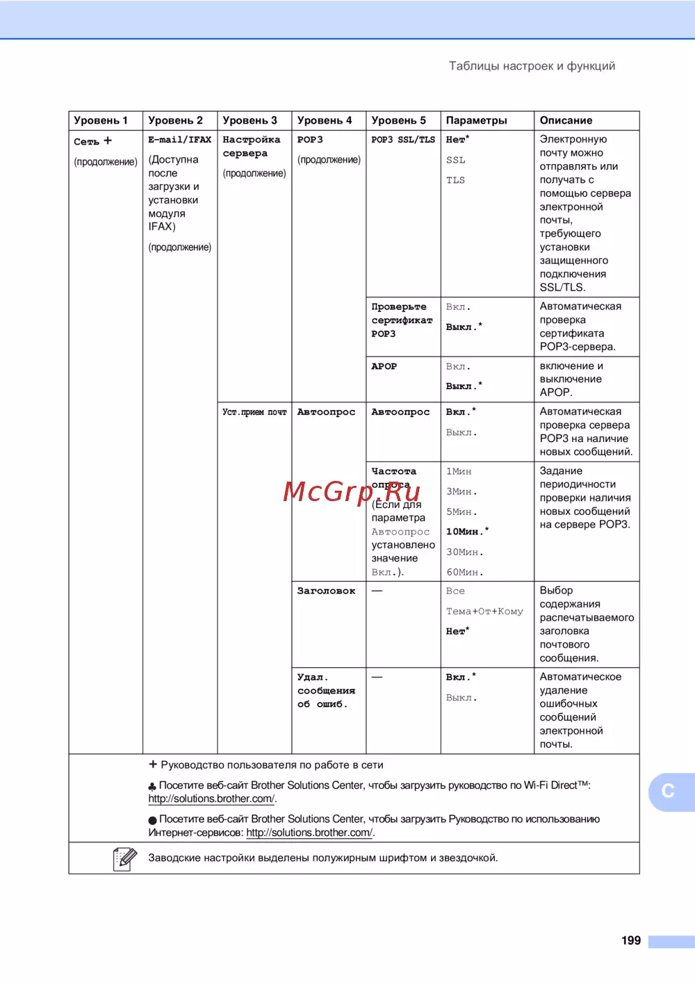 - Заводские настройки выделены полужирным шрифтом и звездочкой p.223