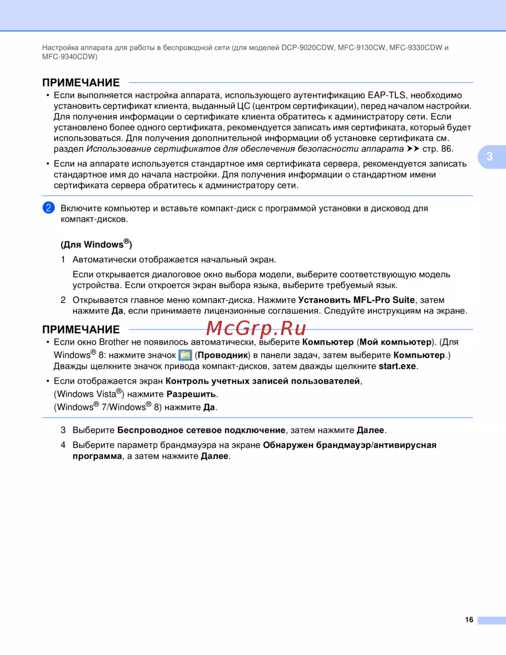- Настройка аппарата для работы в беспроводной сети для моделей dcp 9020cdw mfc 9130cw mfc 9330cdw и mfc 9340cdw p.16