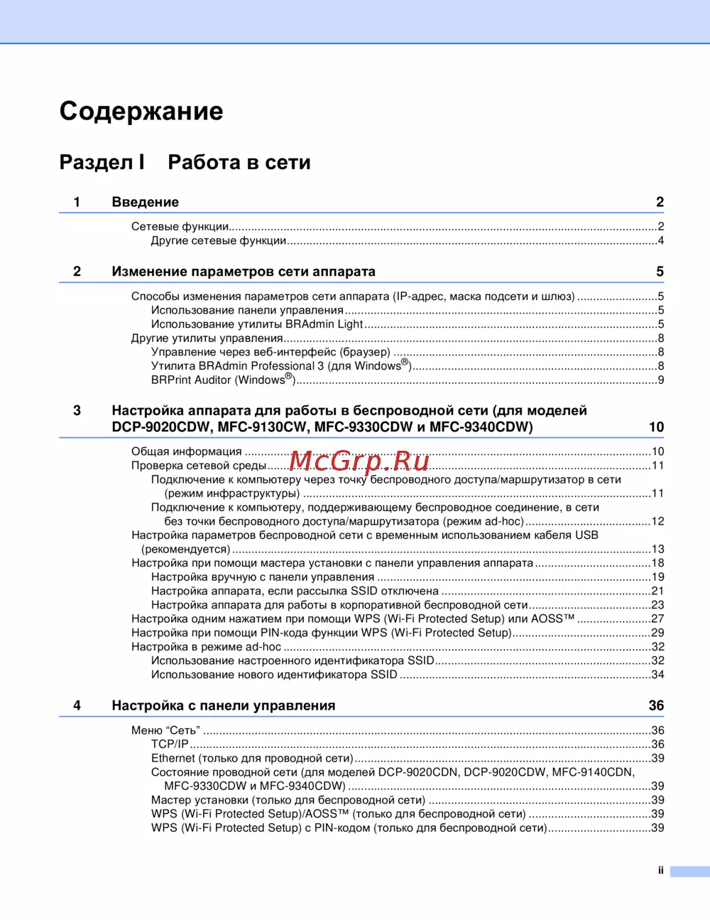 - Настройка аппарата для работы в беспроводной сети для моделей dcp 9020cdw mfc 9130cw mfc 9330cdw и mfc 9340cdw p.16