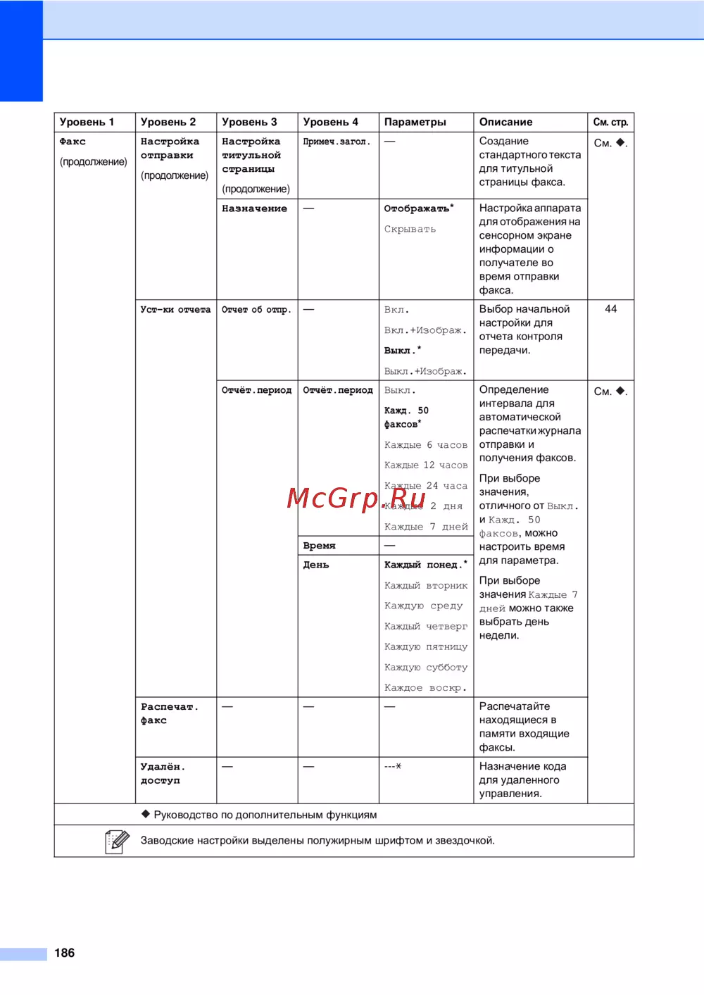 Заводские настройки выделены полужирным шрифтом и звездочкой.