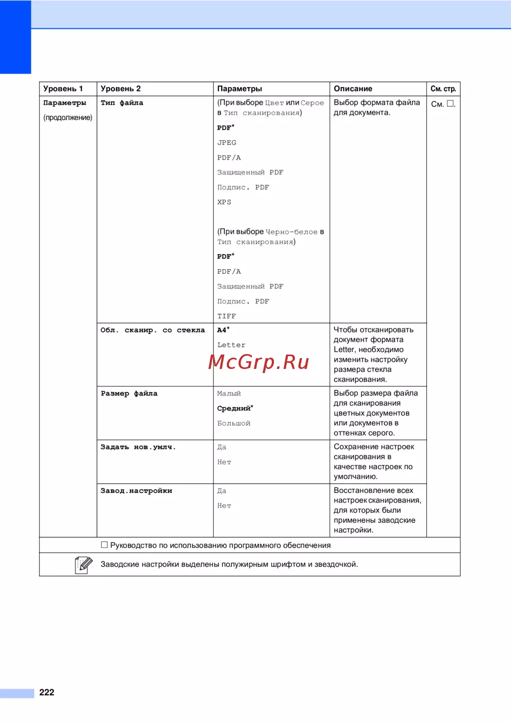 - Заводские настройки выделены полужирным шрифтом и звездочкой p.223