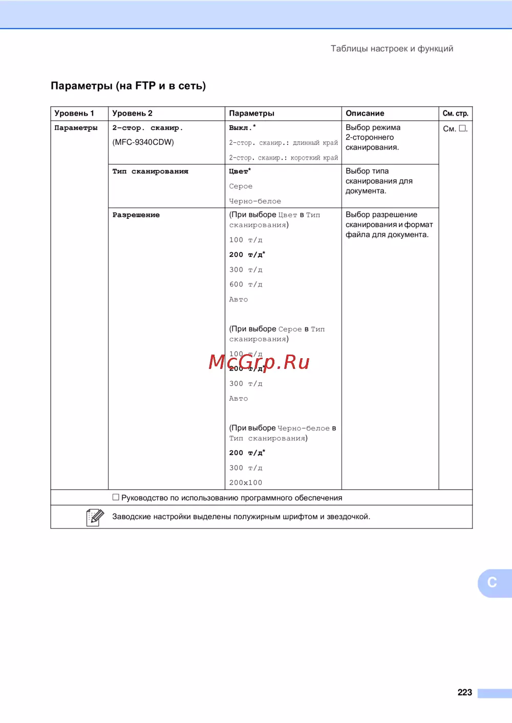 - Заводские настройки выделены полужирным шрифтом и звездочкой p.223