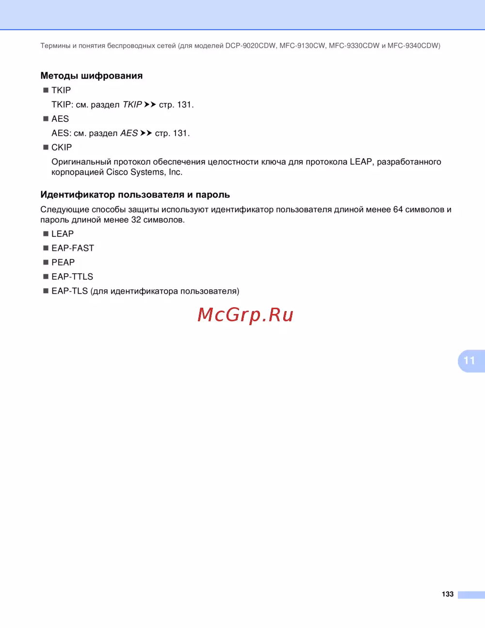Brother MFC-9340CDW — основные термины и методы шифрования в беспроводных сетях [139/156]