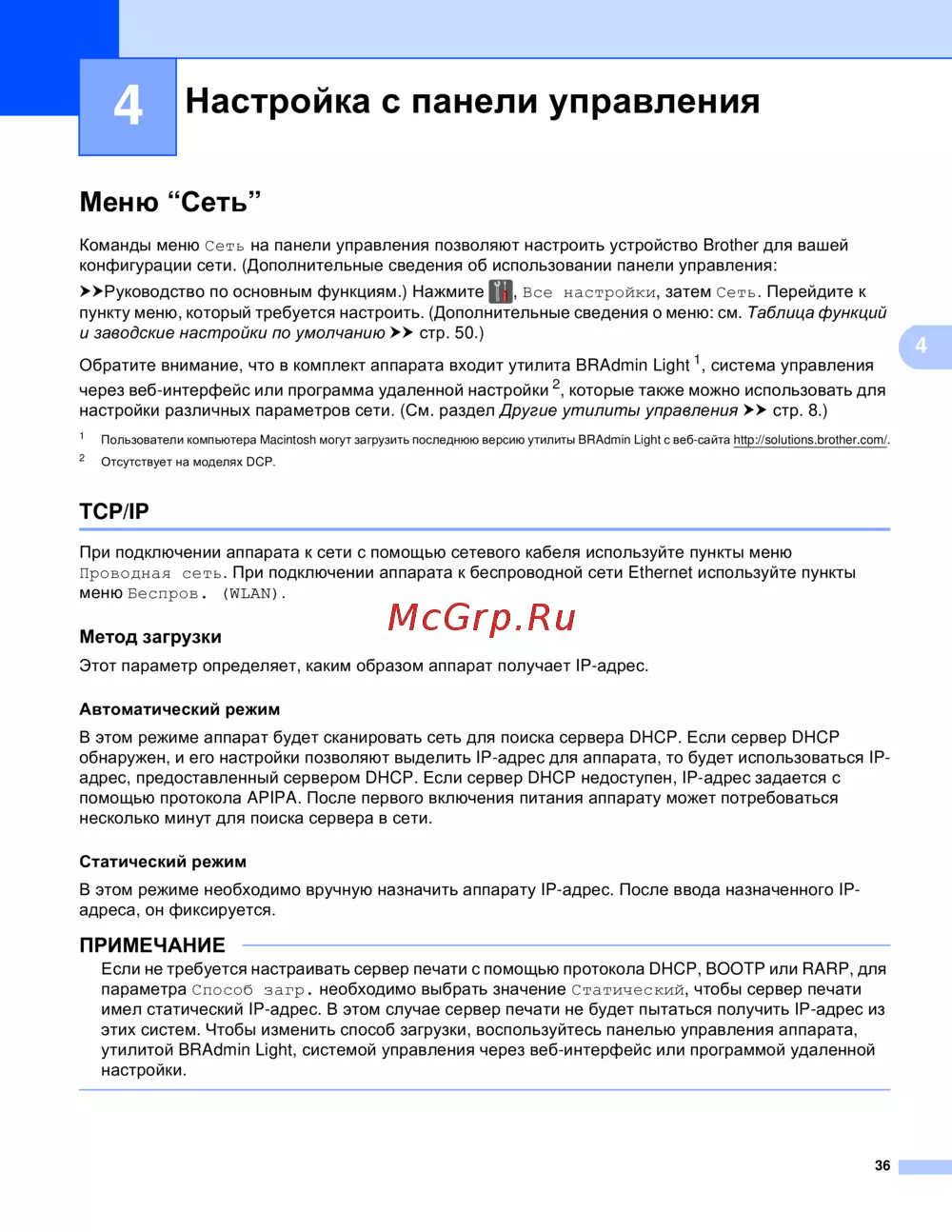 В этом режиме аппарат будет сканировать сеть для поиска сервера DHCP. Если сервер DHCP