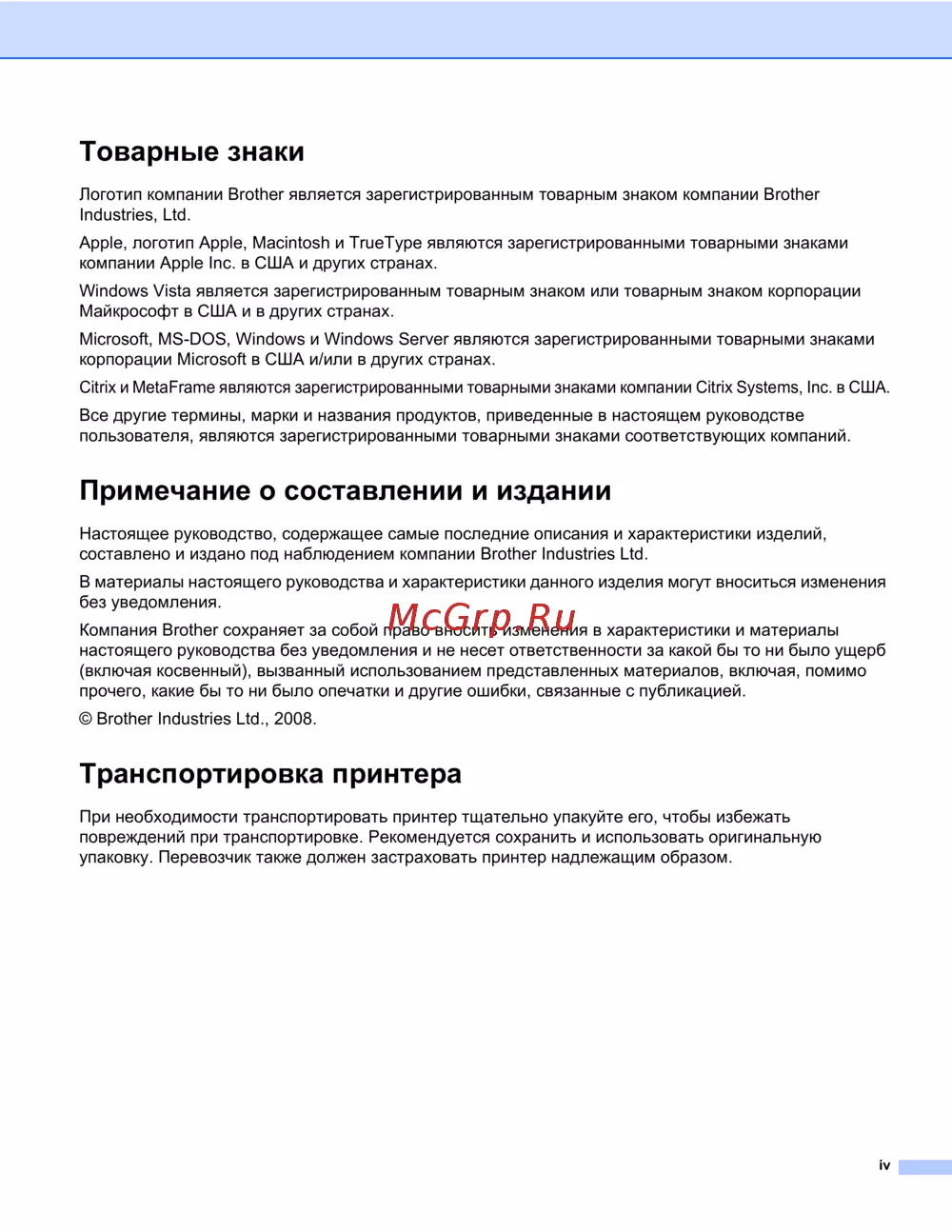 Brother HL-2035R — информация о товарных знаках и транспортировке принтера [5/94]