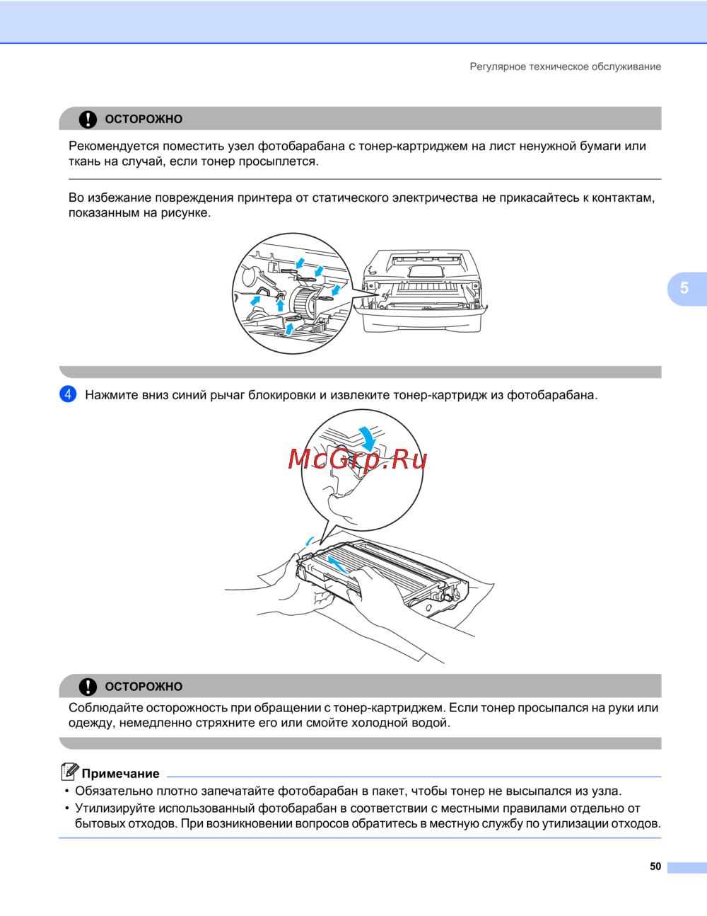 - Примечание обязательно плотно запечатайте фотобарабан в пакет чтобы тонер не высыпался из узла p.57