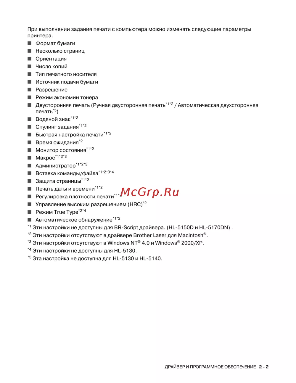 Эти настройки не доступны для BRScript драйвера. (HL5150D и HL5170DN) .