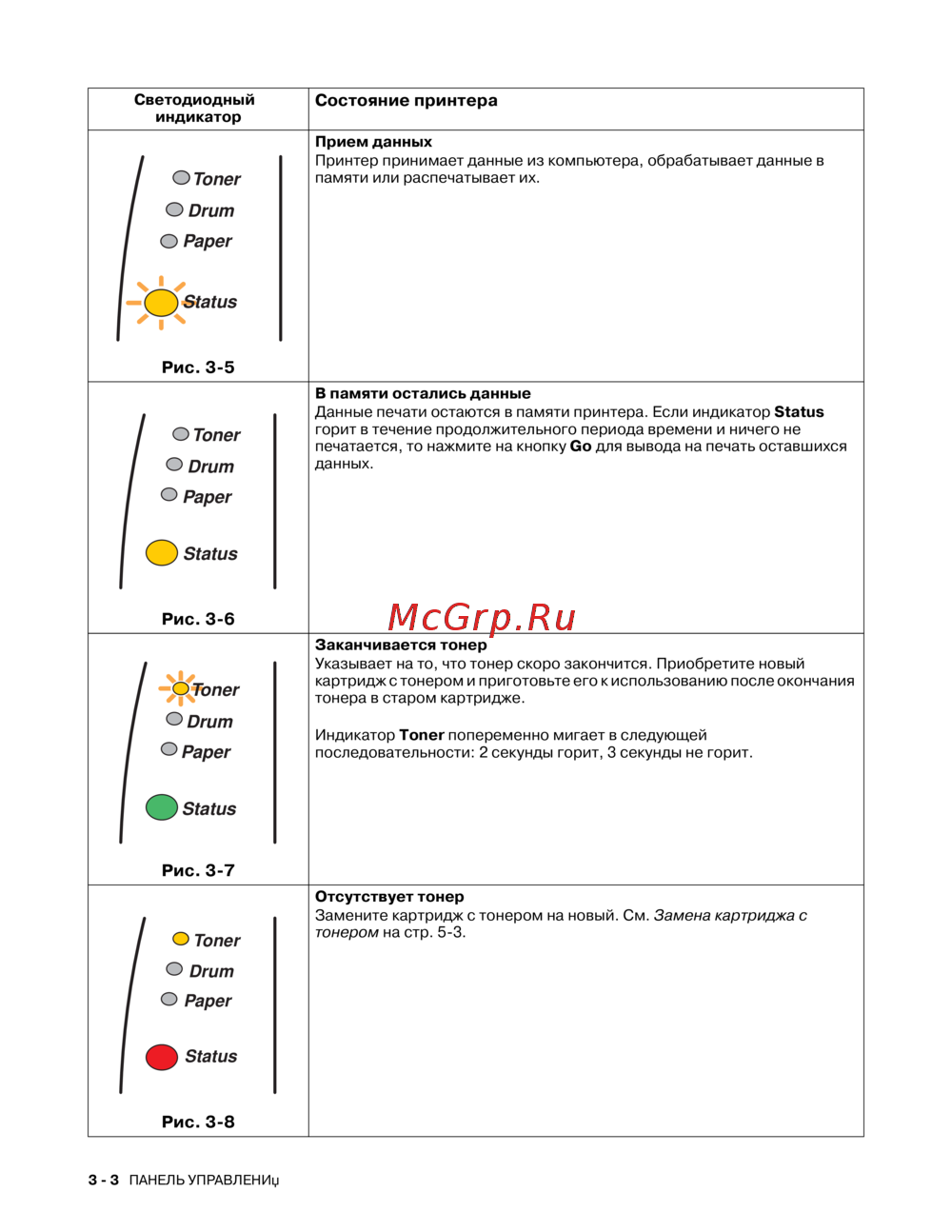 - Монитор состояния выдает сообщения о проблемах связанных с состоянием принтера выполните корректирующие действия перечисленные в приведенной ниже таблице в соответствии с той ошибкой сообщение о которой выдал монитор состояния по умолчанию монитор состояния выключен если необходимо включить монитор состояния измените настройки монитора состояния в поле опции устройства закладки дополнительные см опции устройства на стр 2 6 p.108