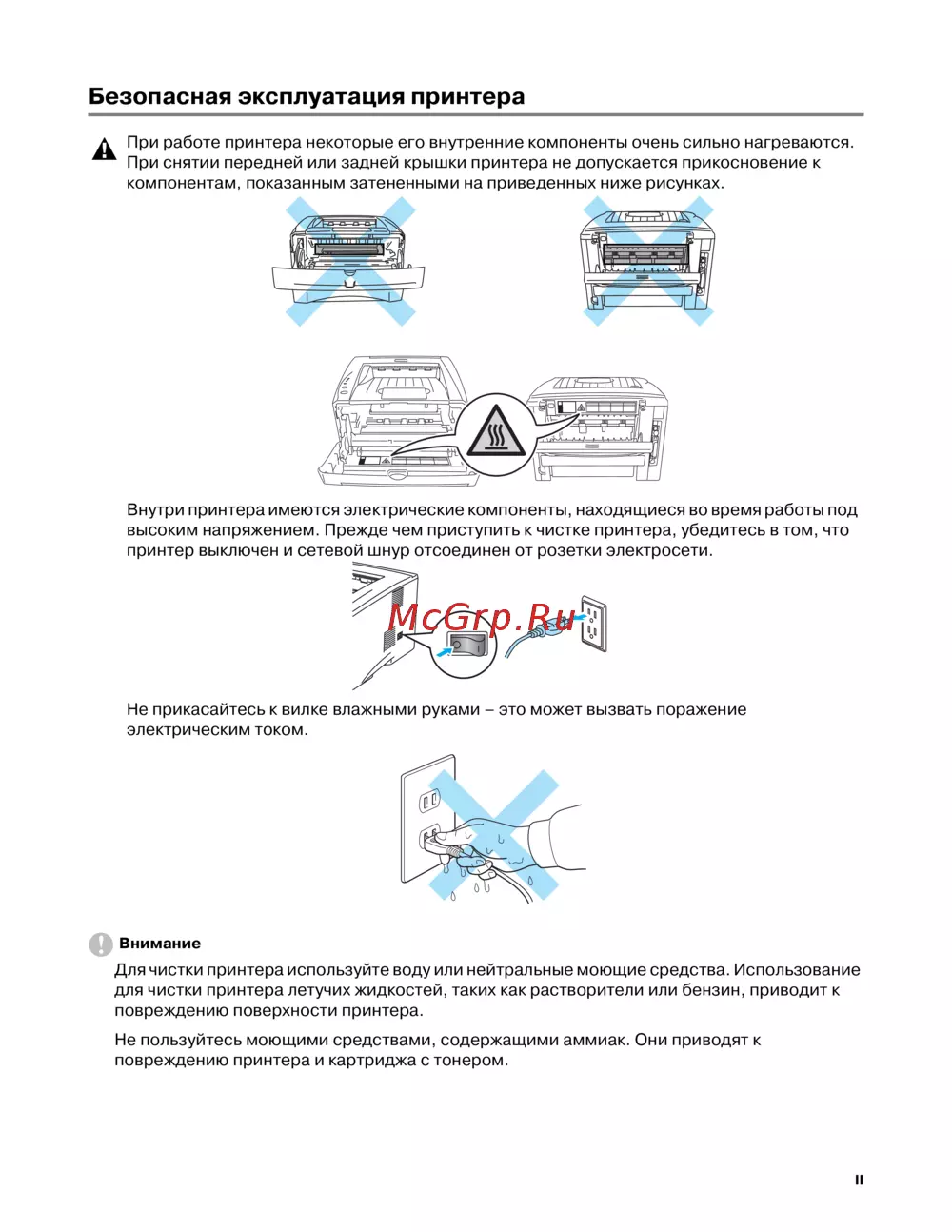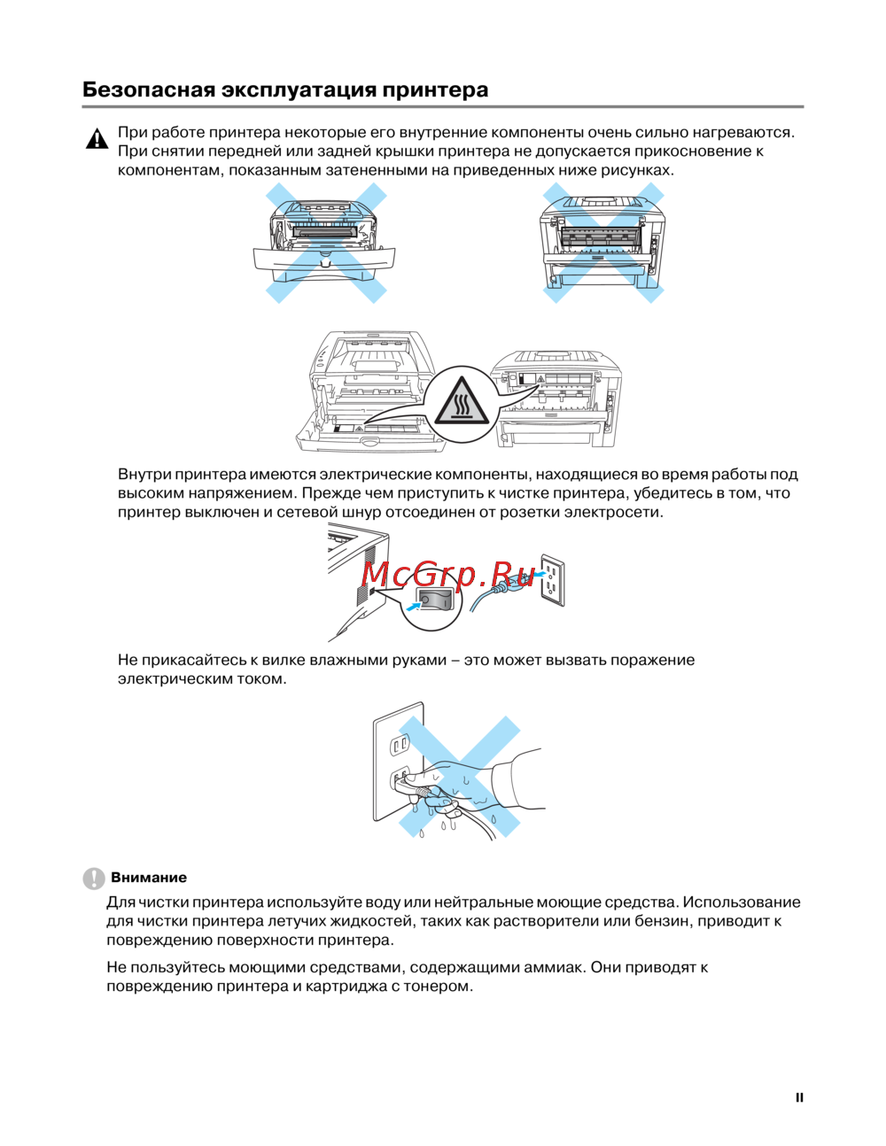 Узнайте, как правильно чистить принтер, чтобы избежать повреждений. Следуйте рекомендациям по безопасной эксплуатации и уходу за устройством.