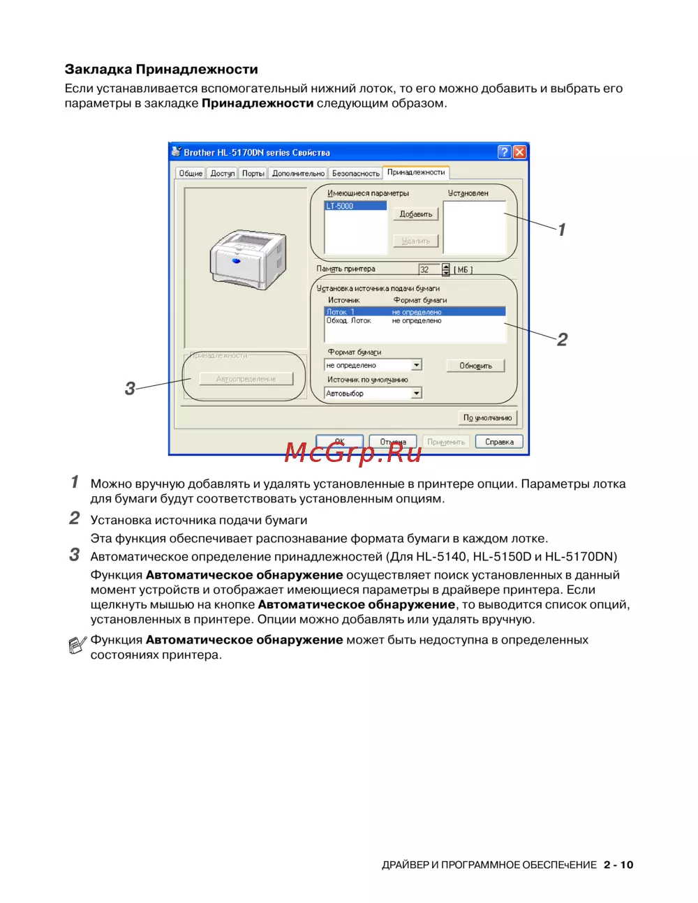 Автоматическое определение принадлежностей (Для HL5140, HL5150D и HL5170DN)