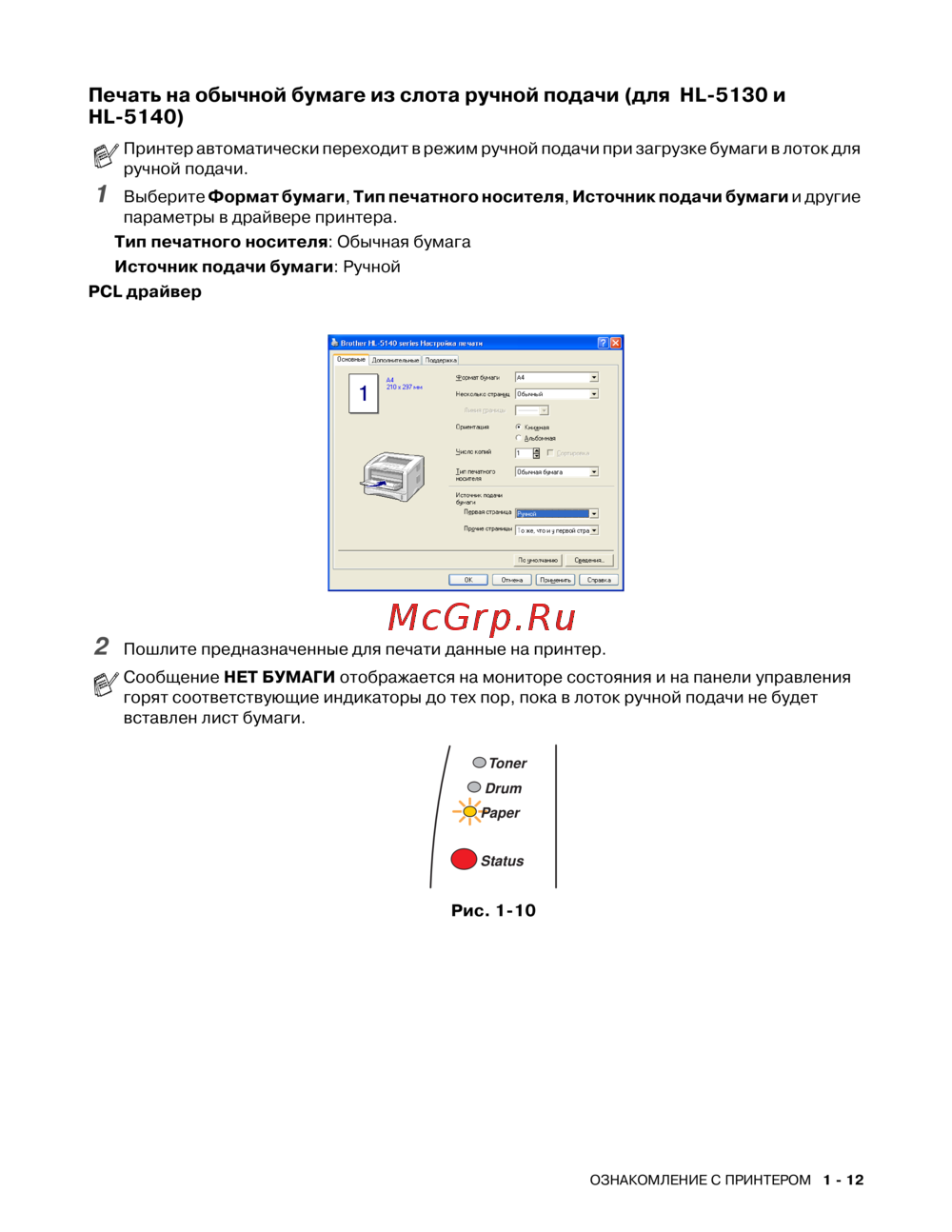 - Печать на плотной бумаге и на открытках из лотка для ручной подачи бумаги для hl5130 и hl5140 p.24