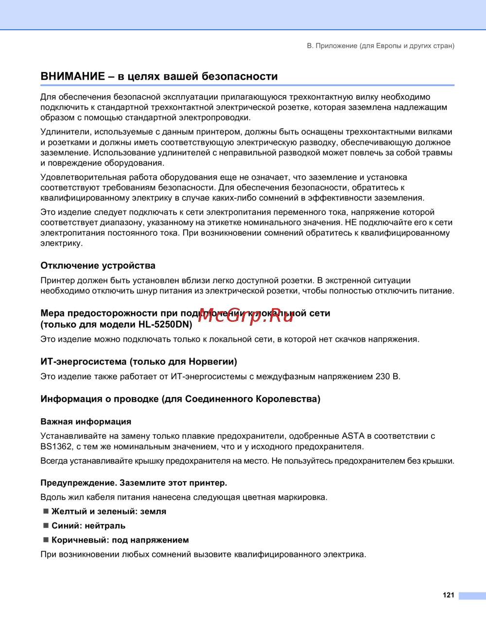 Brother HL-5240 — безопасное подключение электрического оборудования и принтеров [129/133]