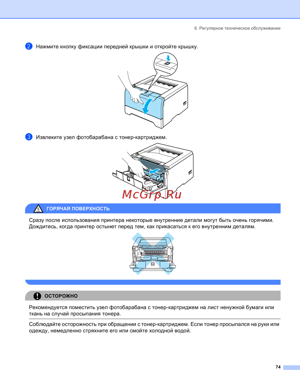 Узнайте, как правильно проводить техническое обслуживание принтера. Следуйте рекомендациям по замене фотобарабана и обращению с тонером для безопасной работы.
