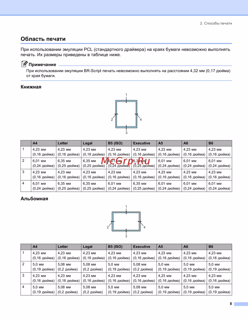 - При использовании эмуляции br script печать невозможно выполнять на расстоянии 4 32 мм 0 17 дюйма от края бумаги p.16
