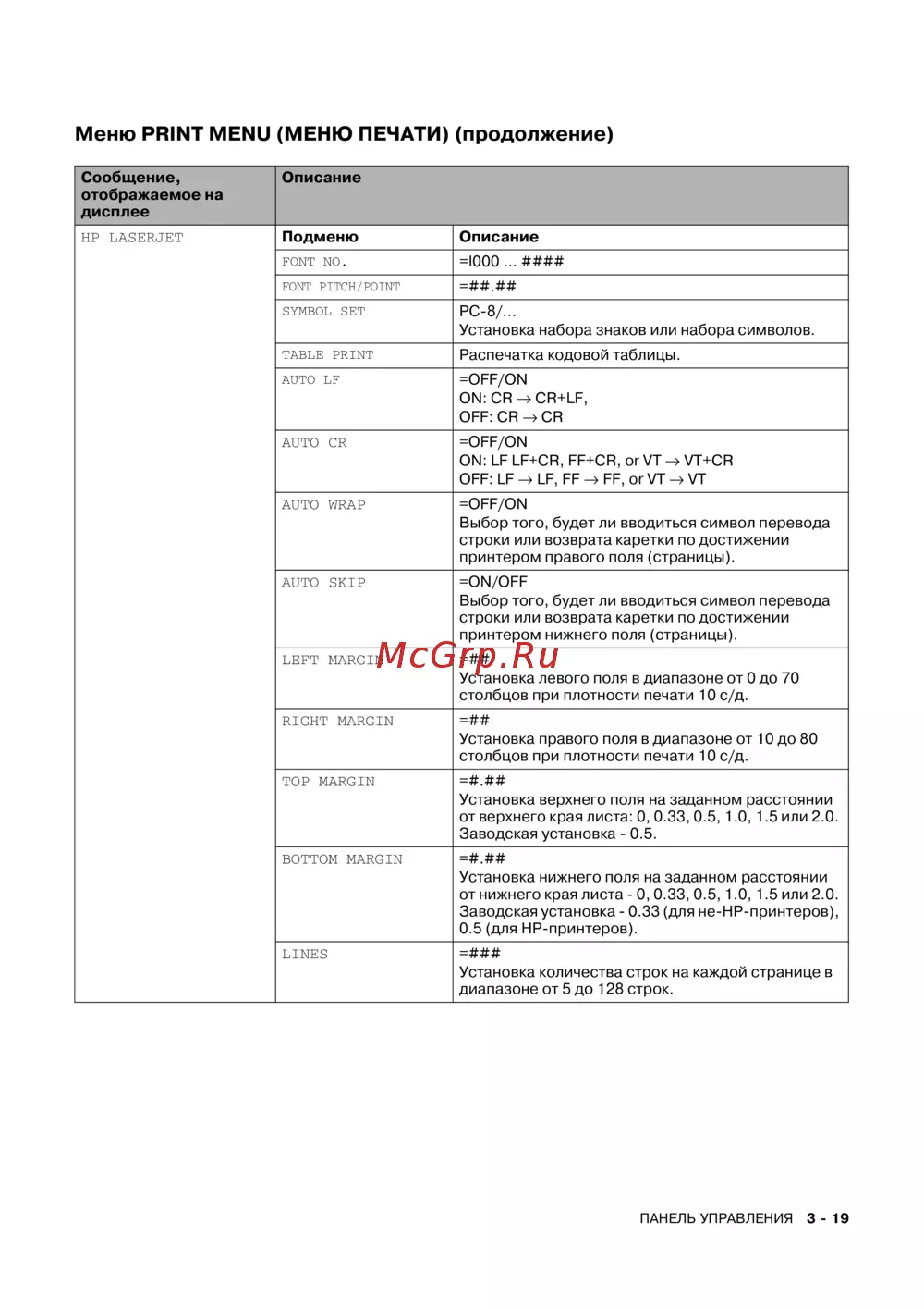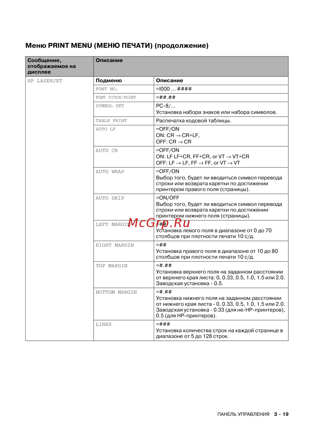 HP LASERJET Подменю Описание