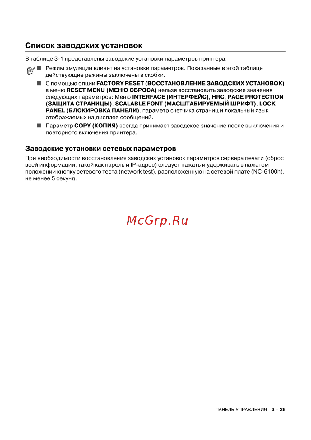 При необходимости восстановления заводских установок параметров сервера печати (сброс