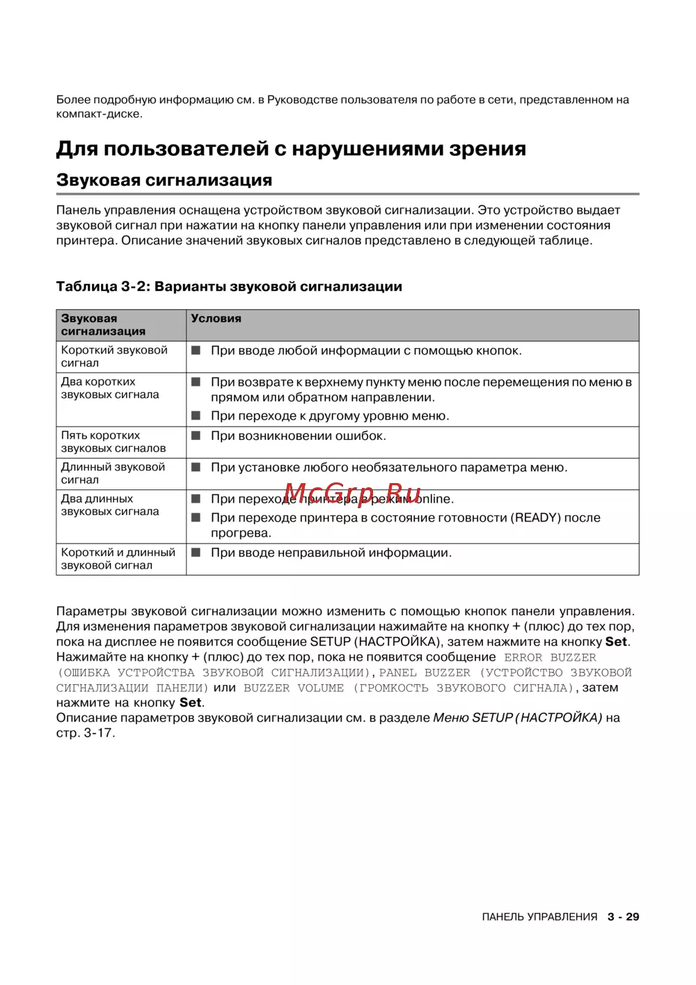 принтера. Описание значений звуковых сигналов представлено в следующей таблице.