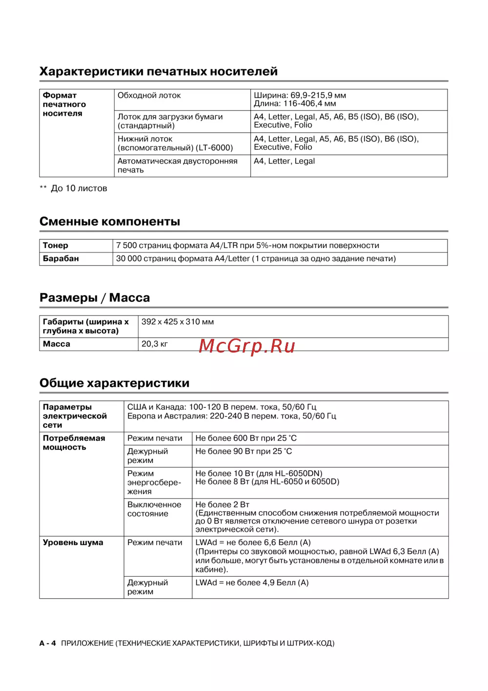 Brother HL-6050 — технические характеристики принтера и параметры печати [175/193]