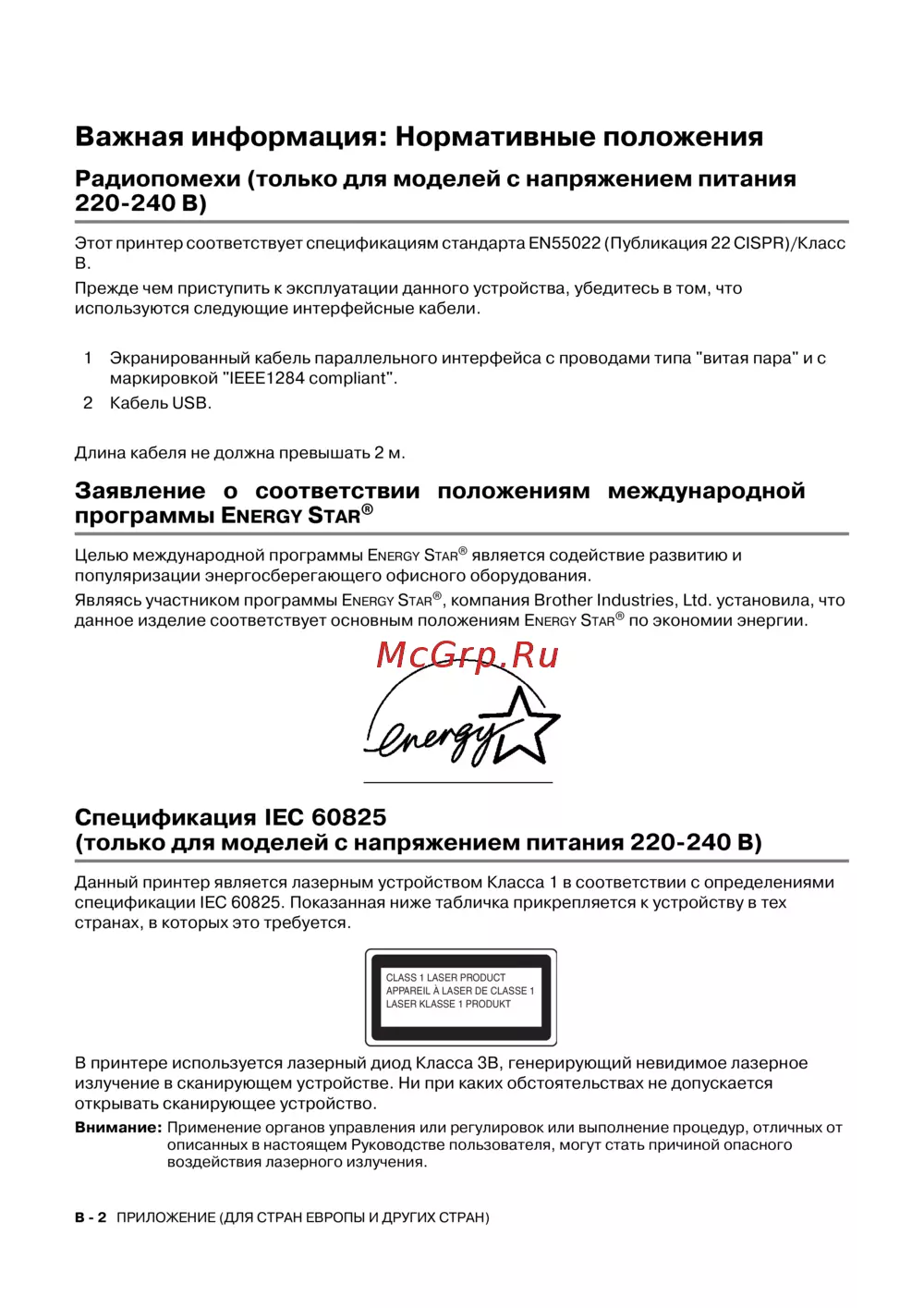 Данный принтер является лазерным устройством Класса 1 в соответствии с определениями
