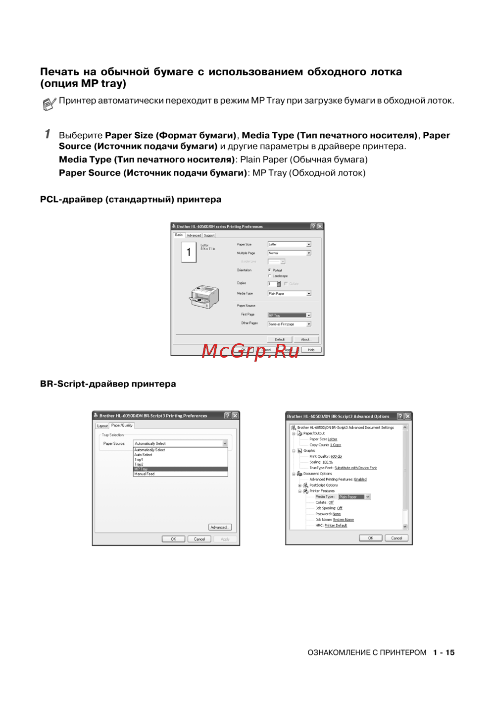 Инструкция по настройке печати на обычной бумаге с использованием обходного лотка (MP tray). Выбор параметров драйвера и автоматический режим работы.